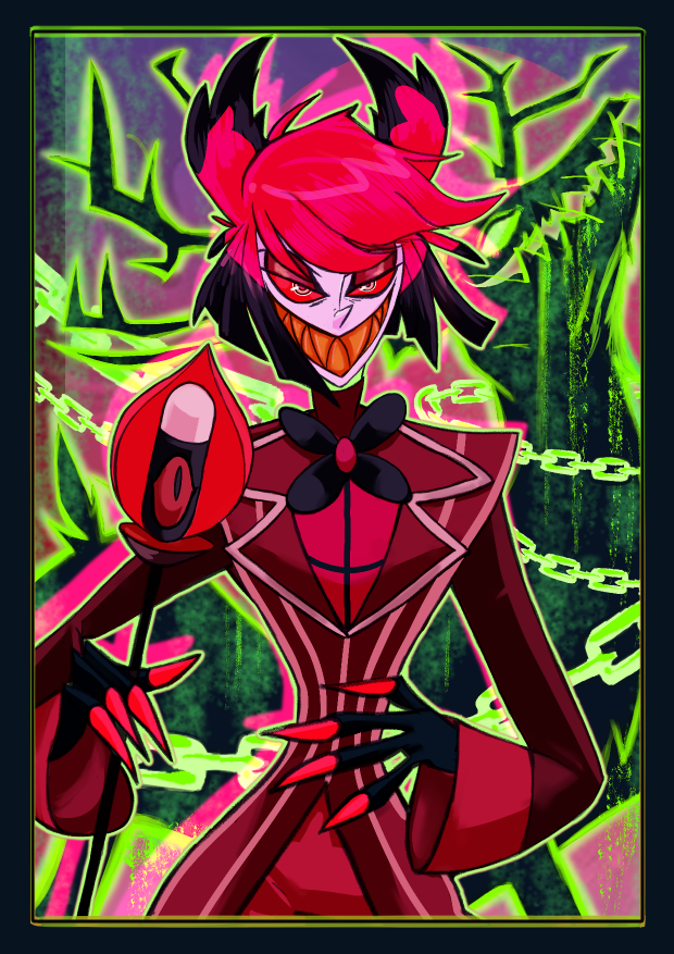 Alastor from Hazbin Hotel, with wendigo and chains as a background.